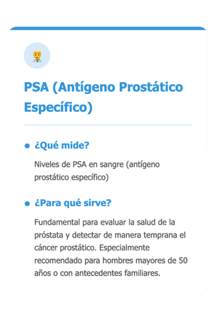 En algunos casos, un hemograma completo alcanza para obtener una visión general del estado de salud y revisar los valores normales del hemograma. Pero en otras situaciones se necesitan estudios más específicos, como el análisis de PSA (detección temprana de cáncer de próstata), un perfil metabólico completo (cómo el cuerpo utiliza los alimentos y la energía así como el equilibrio de ciertos químicos en el cuerpo) o un test de mononucleosis en cuadros de fatiga intensa.
